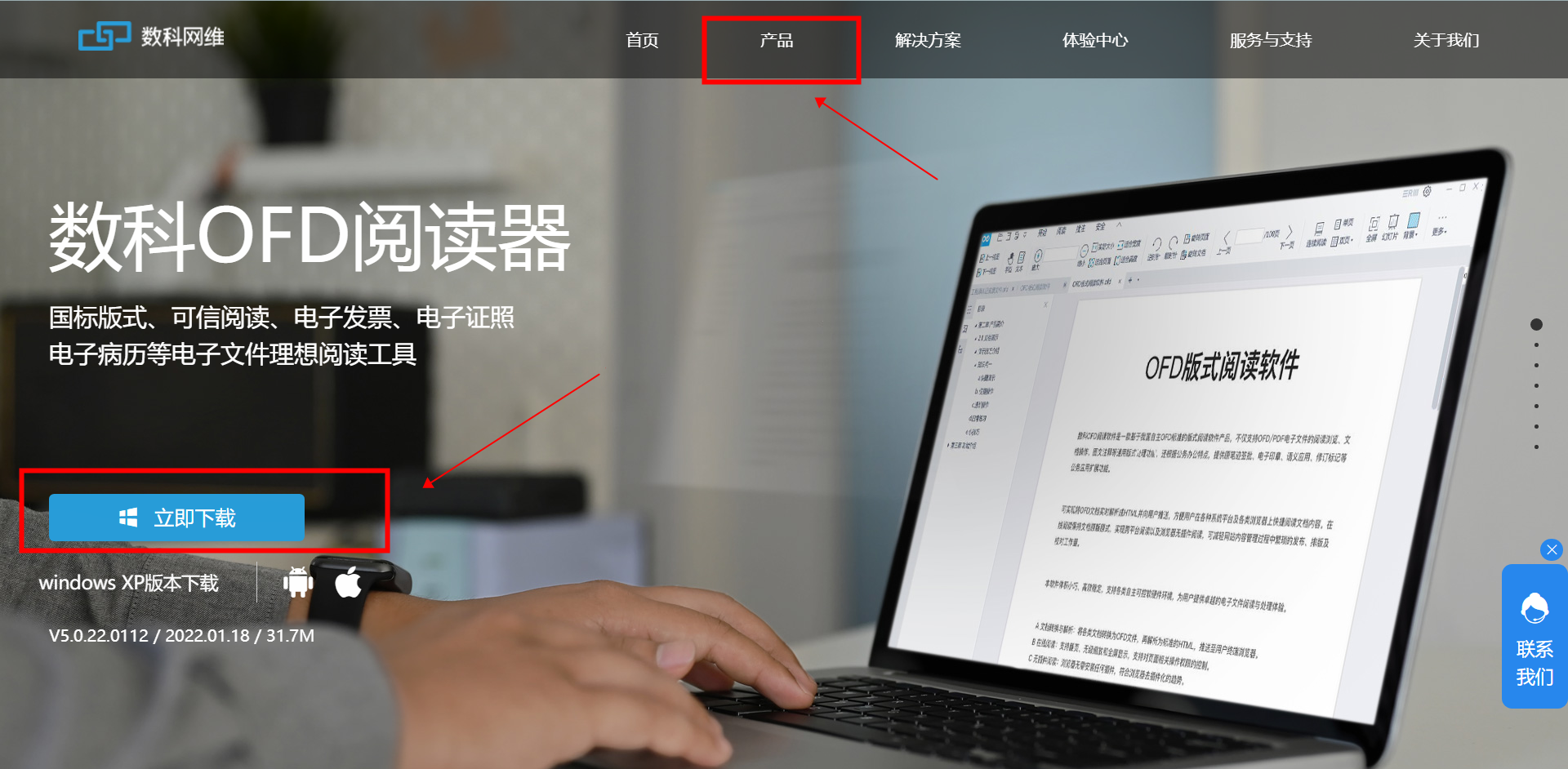①,打开数科网维官网首页,打开产品页,选择数科OFD阅读器进行下载