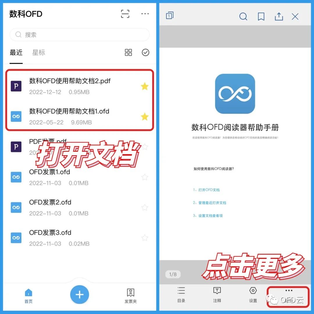 ▐ 步骤一:在移动端的数科OFD打开所有需要合并的文档,使得文档在首页列表中显示。打开一个文档,点击右下角的更多。